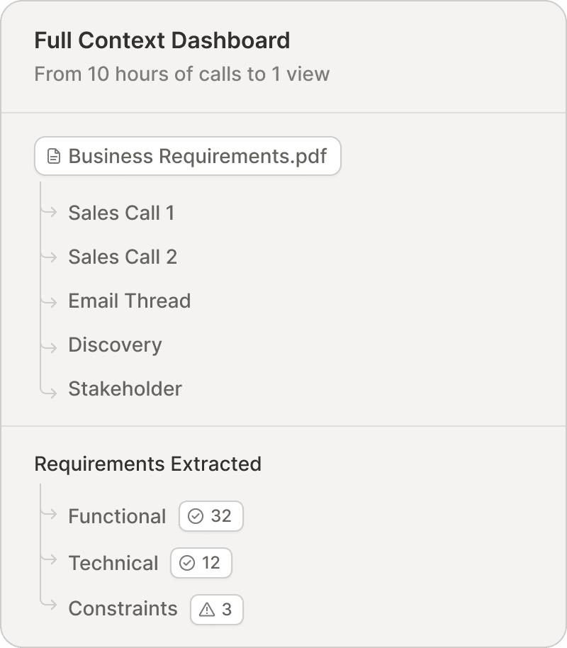 Your SEs sell the solution. Ferris turns 8 hours of meetings and 47 pages of notes into requirements your delivery team can use without starting from scratch.
