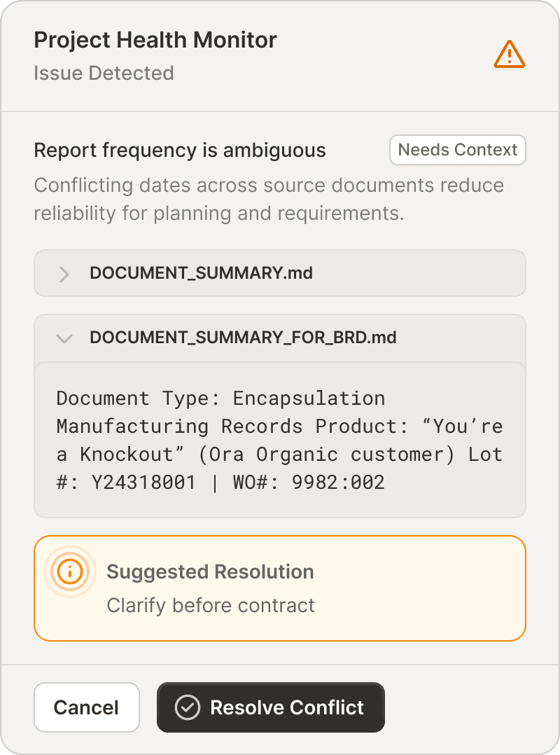 "Ferris caught misalignments we would have found in UAT—or worse, after go-live. Survey options that got missed, requirements that contradicted each other across calls. It surfaces conflicts early so we fix them in a conversation, not a change order."